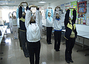 | Employees of Calbee doing pre-work stretching exercises together at the workplace |